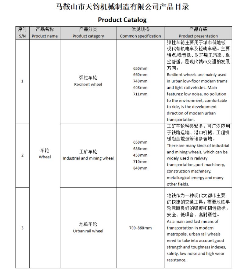 Компания Maanshan Tianjun Machinery Manufacturing Co., LTD является ведущим поставщиком колес, осей, шин и колесных пар для локомотивов, пассажирских вагонов, вагонов, метро и других железнодорожных и горных вагонов, специализирующихся на послепродажном обслуживании и ремонте. Индивидуальное решение – это обязательство нашей компании. Пожалуйста, свяжитесь с нами для поставки лучших продуктов для вас!